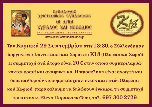 Ο Σύλλογος Αγίων Κύριλλου και Μεθόδιου Ολυμπιακού Χωριού σας προσκαλεί στην Συνεστίαση και Χορό που διοργανώνει την Κυριακή 29 Σεπτεμβρίου στις 13:30 στο Κ18 (Ολυμπιακό Χωριό).