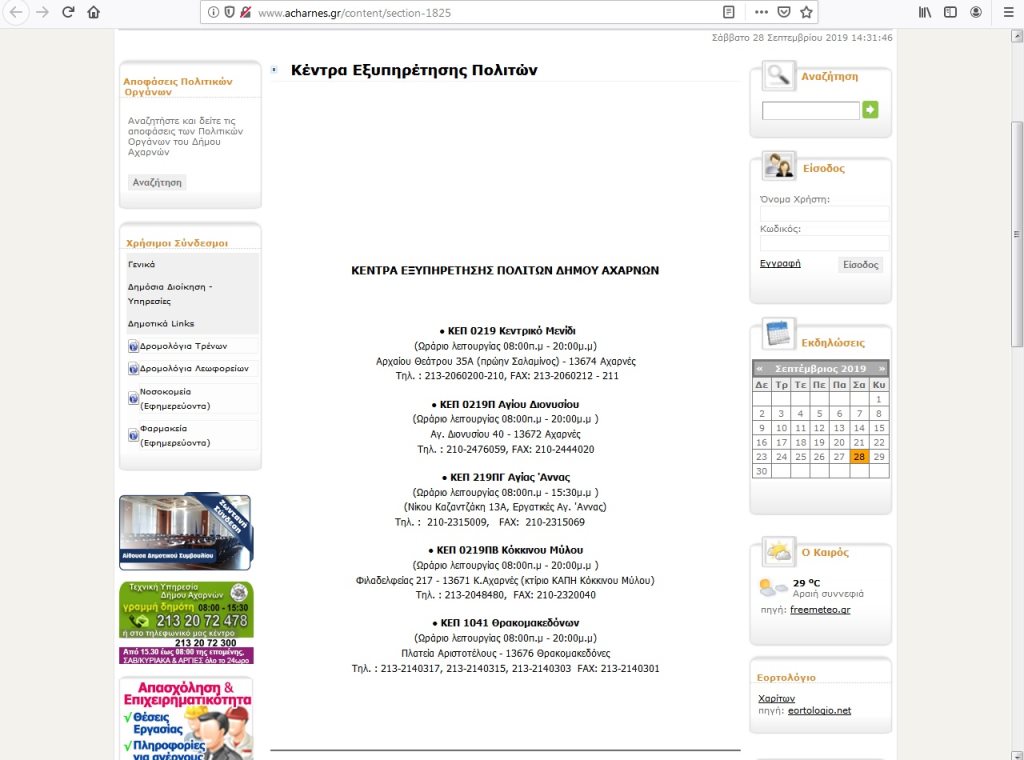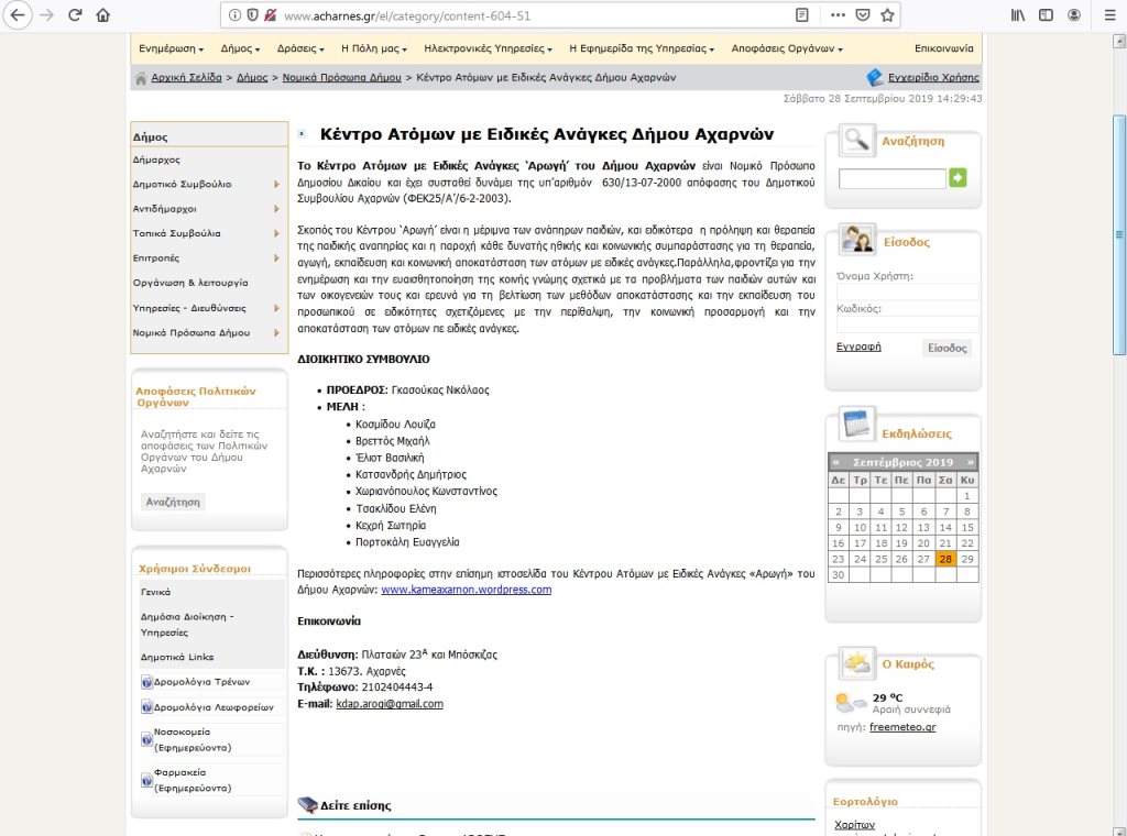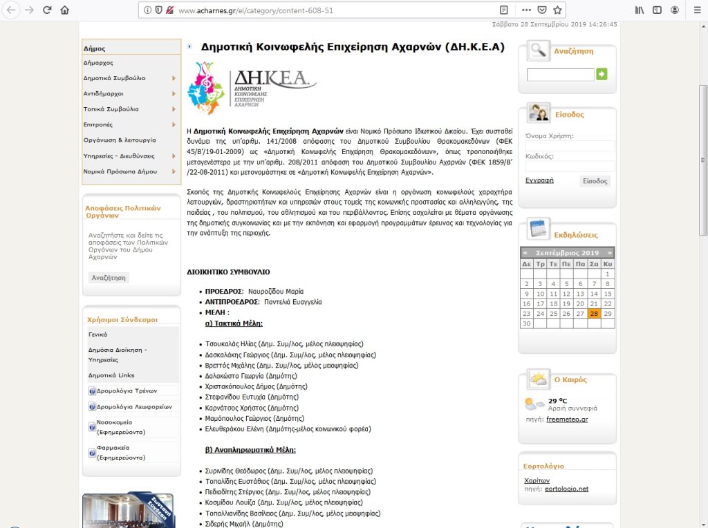 Να υπενθυμίσουμε στους διαχειριστές της σελίδας του Δήμου Αχαρνών, ότι μια εβδομάδα μετά το Δημοτικό Συμβούλιο της 23ης Σεπτεμβρίου από το οποίο προέκυψαν τα νέα Δ.Σ. των Νομικών Προσώπων του Δήμου και ένα μήνα μετά την λειτουργία του Κ.Ε.Π. Ολυμπιακού Χωριού -το οποίο παρεμπιπτόντως δεν έχει στρογγυλή σφραγίδα για την εξυπηρέτηση των πολιτών- οι αντίστοιχες σελίδες του ιστότοπου του Δήμου δεν έχουν ενημερωθεί ακόμα όπως φαίνεται παρακάτω.