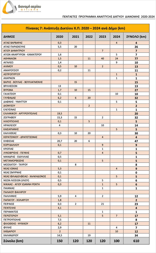 Ειδικότερα κατά την περίοδο 2020-2024 προβλέπεται η κατασκευή νέων δικτύων χαμηλής πίεσης μήκους 610 χιλιομέτρων. Από αυτά, τα 77 χλμ. θα κατασκευαστούν στον Δήμο Αθηναίων, 47 χλμ. στην Κηφισιά, 34 χλμ στο Χαλάνδρι, 32 χλμ στου Ζωγράφου και τη Γλυφάδα, 30 χλμ στην Καλλιθέα (εδώ ο αναλυτικός πίνακας με τις επεκτάσεις δικτύων ανά δήμο της Αττικής).