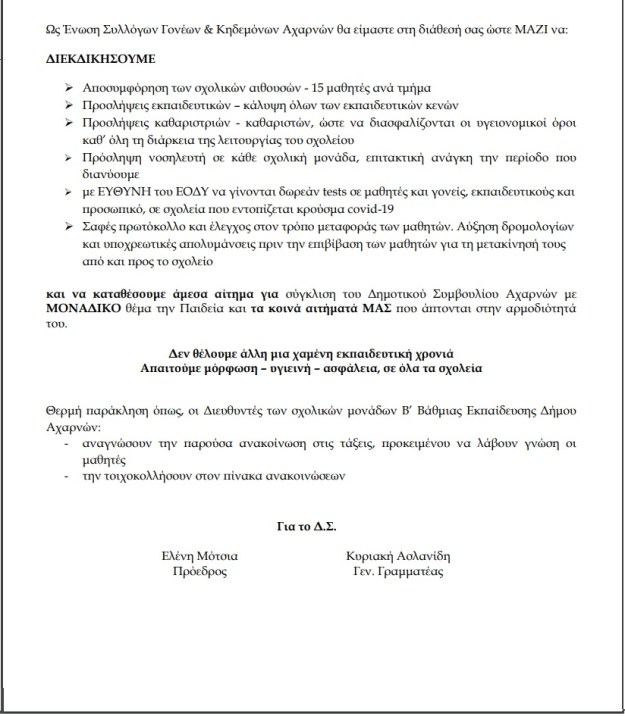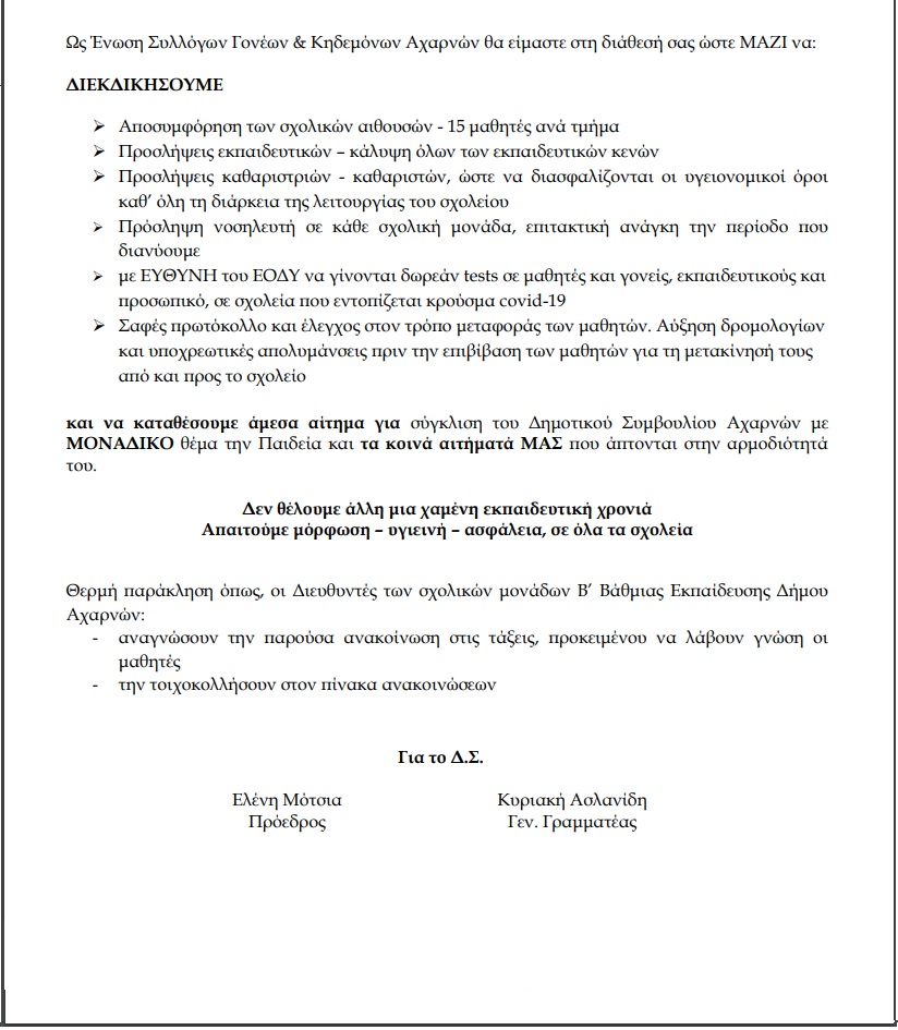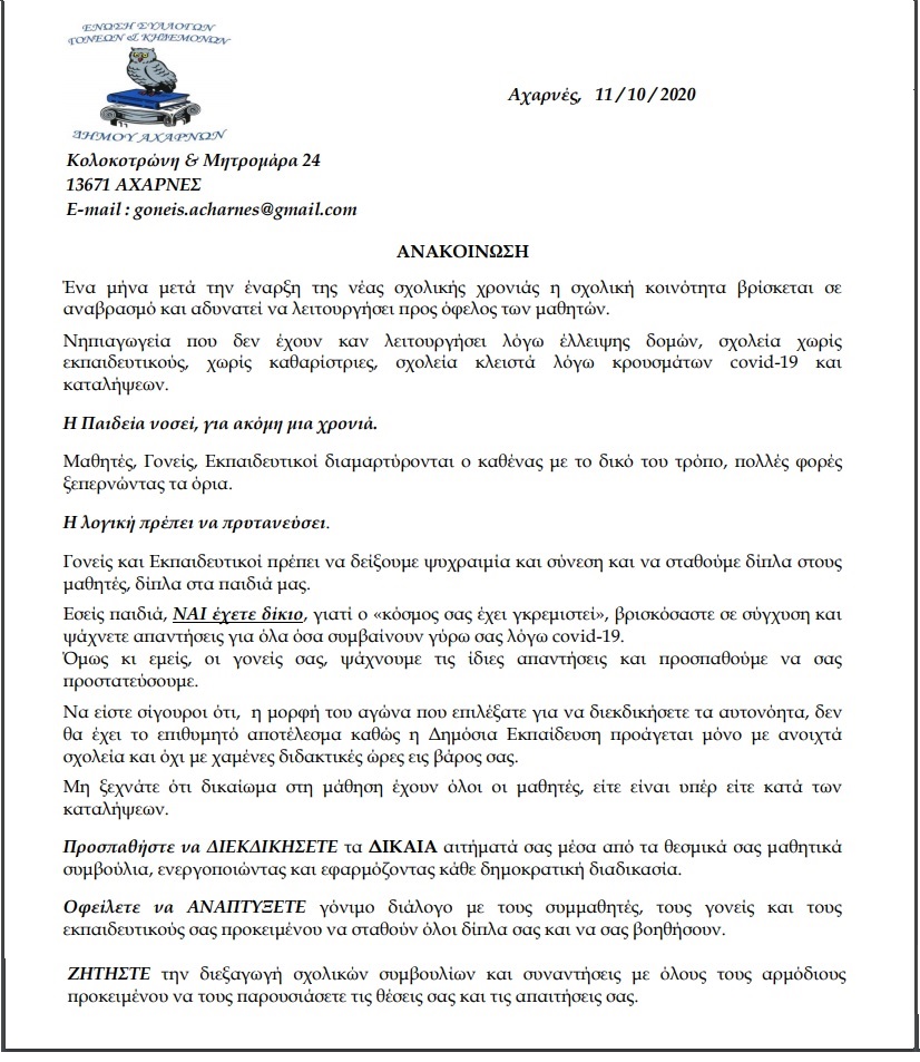 Ένωση Γονέων και Κηδεμόνων Δήμου Αχαρνών: Η Παιδεία νοσεί για ακόμα μια χρονιά – Απαιτούμε μόρφωση – υγιεινή – ασφάλεια, σε όλα τα σχολεία Υποβολή σχολίου Ανακάλυψε περισσότερα από Επιτομή ειδήσεων Εγγραφείτε για να λαμβάνετε τις τελευταίες αναρτήσεις στο email σας. Πληκτρολόγησε το email σου… Εγγραφή Μοιραστείτε το: Κλικ για εκτύπωση(Ανοίγει σε νέο παράθυρο) Εκτύπωση Κλικ για αποστολή ενός συνδέσμου μέσω email σε έναν/μία φίλο/η(Ανοίγει σε νέο παράθυρο) Email Πατήστε για κοινοποίηση στο Facebook(Ανοίγει σε νέο παράθυρο) Facebook Κλικ για κοινοποίηση στο LinkedIn(Ανοίγει σε νέο παράθυρο) LinkedIn Κάνε κλικ για να μοιραστείς στο X(Ανοίγει σε νέο παράθυρο) Χ Πατήστε για να μοιραστείτε στο WhatsApp(Ανοίγει σε νέο παράθυρο) WhatsApp Κλικ για κοινοποίηση στο Tumblr(Ανοίγει σε νέο παράθυρο) Tumblr Κλικ για κοινοποίηση στο Pinterest(Ανοίγει σε νέο παράθυρο) Pinterest Κλικ για κοινοποίηση στο Reddit(Ανοίγει σε νέο παράθυρο) Reddit Πατήστε για να μοιραστείτε στο Telegram(Ανοίγει σε νέο παράθυρο) Telegram Μου αρέσει! Φόρτωση... Σχετικά
