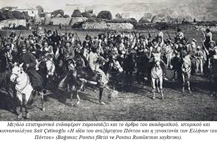 «Πριν από τον Πρώτο Παγκόσμιο Πόλεμο η Ελλάδα, που είδε ότι άρχισε να καταρρέει το οθωμανικό κράτος, και το Ρωμαίικο Πατριαρχείο του Φαναρίου άρχισαν τις προπαγανδιστικές προσπάθειες, με σκοπό την ίδρυση ποντιακού κράτους σχετικά με τους Έλληνες που ζούσαν στην περιοχή της ανατολικής Μαύρης Θάλασσας». (Cazgız V. κ. ά. ό. π., 2010, σ. 56)