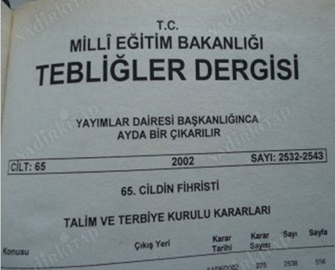 Tebliğler Dergisi –αντίστοιχο του ελληνικού ΦΕΚ- αριθ. 2538, Ιούλης 2002 (Milli Eğitim Bankalığı Tebliğer Dergisi, Cilt: 65,Temmuz 2002, sayı: 2538, s. 541-544)