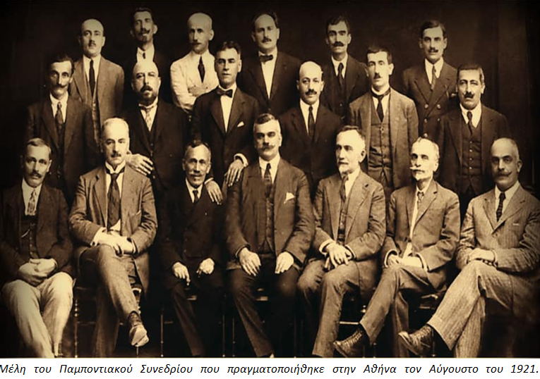 Μέλη του Παμποντιακού Συνεδρίου που πραγματοποιήθηκε στην Αθήνα τον Αύγουστο του 1921. Καθιστοί από αριστερά: Δ. Χαραλαμπίδης, Π. Μειλιχιάδης, Δ. Οικονομίδης, Ε. Παυλίδης, Π. Γελκεντζόγλου, Αρ. Νεόφυτος και Α. Πιαλόγλου. Όρθιοι 1ης σειράς: Θ. Παρασκευάς, Β. Καλλιφίδης, Γ. Θωίδης, Χ. Καλατζίδης, Ε. Δεϊρμεντζόγλου και Γ. Υψηλάντης. Όρθιοι 2ης σειράς: Κ. Σιδηρόπουλος, Ν. Κακουλίδης, Χ. Μυρίδης, Ν. Λεοντιάδης. Ε. Ελευθεριάδης και Θ. Ευκαρπίδης.