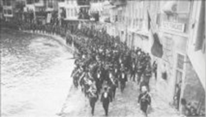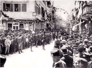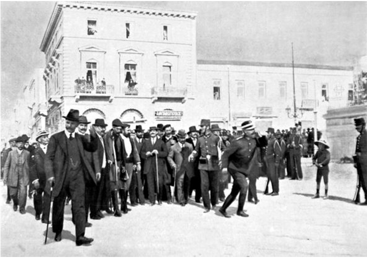 Χανιά 1 Δεκέμβρη 1913. Η πομπή για την ύψωση της Ελληνικής Σημαίας στο Φρούριο Φιρκά, μπαίνει στην πλατεία Μαυροβουνίων με κατεύθυνση το Φρούριο Φιρκά.