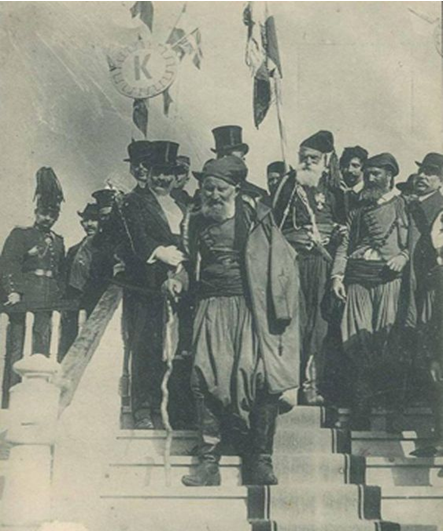 Χανιά 1 Δεκέμβρη 1913, Φρούριο Φιρκά. Ο υπέργηρος (94 ετών) Αναγνώστης Μάντακας, υποβασταζόμενος από τον Γενικό Διοικητή Κρήτης Λουκά Ρούφο, κατεβαίνει από τον πυργίσκο του φρουρίου Φιρκά, όπου υψώθηκε η σημαία της Ένωσης της Κρήτης με την Ελλάδα. Πιο πίσω με τα λευκά γένια είναι ο 81χρονος οπλαρχηγός Χατζημιχάλης Γιάνναρης. Οι δυο οπλαρχηγοί είχαν τιμηθεί εκείνη τη μέρα από τον Βασιλιά Κωνσταντίνο με τον Χρυσό Σταυρό του Σωτήρα.