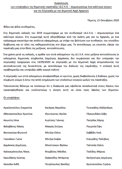 –Κ. Δαμάσκο, ύστερα από την σύμπραξη που έλαβε χώρα στο Δήμο μας τον Σεπτέμβριο, δηλώσατε πως δεν συμφωνείτε σε αυτή και δεν αποτελείτε μέρος της, ενώ με ανακοίνωσή σας, κάνατε γνωστό ότι συνεχίζετε να εκπροσωπείτε τους φίλους της παράταξης «ΔΕΚΑ»;. Θα θέλαμε να μας εξηγήσετε τελικά, τι ακριβώς είστε θεσμικά; Ανεξάρτητος δημοτικός σύμβουλος ή δημοτικός σύμβουλος της παράταξης «ΔΕΚΑ»; Υπάρχει πια η παράταξη «ΔΕΚΑ»;